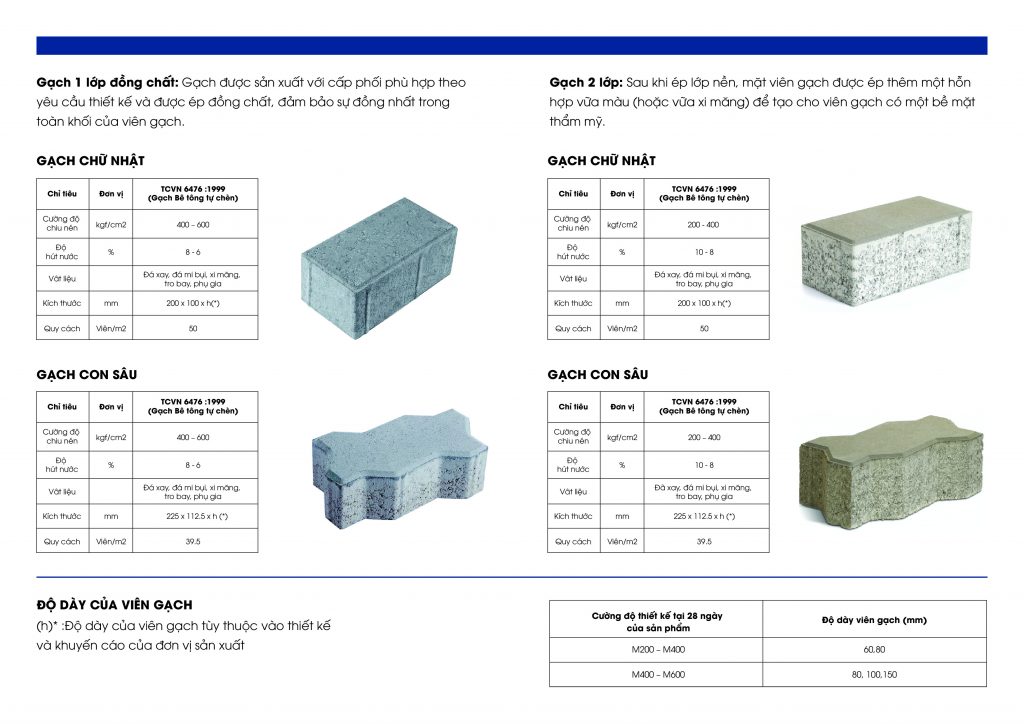 Là loại gạch bê tông tự chèn sản xuất trên dây chuyền hiện đại với công nghệ châu âu, tuân thủ theo tiêu chuẩn TCVN 6476:1999 đảm bảo các yếu tố sau
